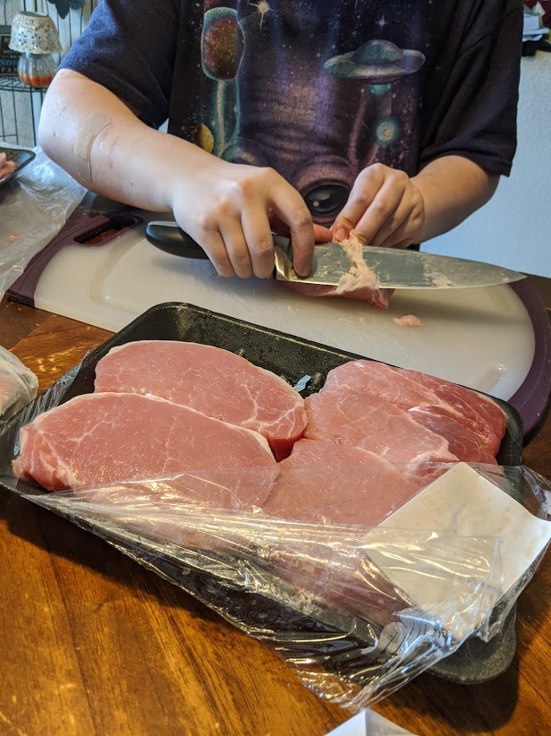 Butterflying and then cutting all the way through to get 2 thinner pork chops each . . .