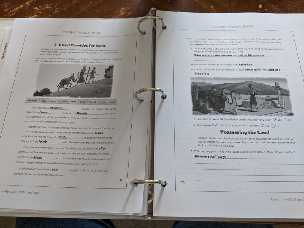 I very much like this company! Upon research of the company’s doctrinal statement, I discovered that it lines right up with our beliefs. I also appreciate that when the student is directed to look up scripture, they are given the reference as opposed to having it directly written out. I am happy about this for two reasons. One, because we use only the King James Version of The Bible, and it makes is difficult when the student is asked to copy a written out verse from a different version. We don’t often find curricula which uses only the KJV. Two, having just the reference forces the student to actually look up the scripture, which I would much rather that they do.